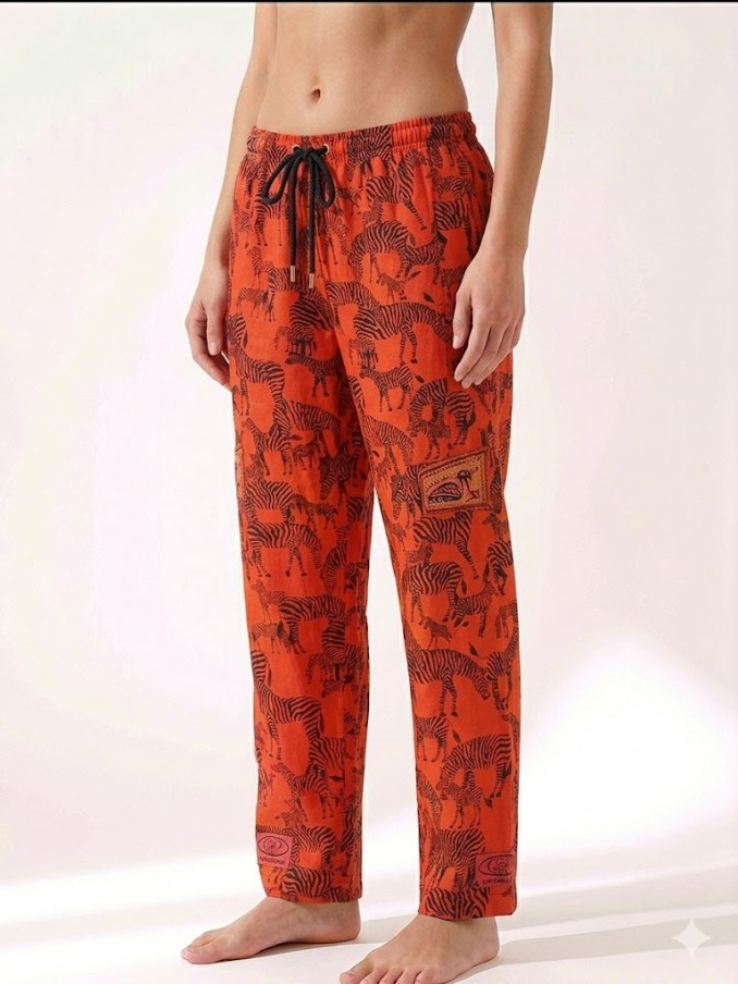 A modern take on animal print. These trousers feature a warm orange base with a dense, hand-drawn style zebra pattern. Relaxed straight-leg cut with deep pockets.