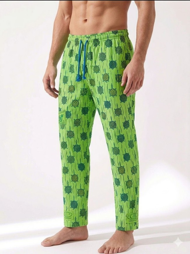 Refresh your style with these vibrant lime green trousers featuring detailed shell motifs and an adjustable blue drawstring for a secure fit.